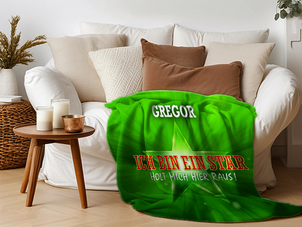 Deine personalisierte Kuscheldecke im "Ich bin ein Star" Style ist der perfekte Begleiter für alle Fans! Ob als Highlight im Wohnzimmer, auf dem Bett oder für einen entspannten Sonntag auf dem Sofa – diese Decke lädt immer zum Kuscheln ein. Mit ihrem stylischen Dschungelcamp-Design ist sie nicht nur gemütlich, sondern auch ein echter Hingucker. Unsere Plüschdecke mit deinem Namen ist der Beweis: Fan-Merch kann persönlich und hochwertig sein!